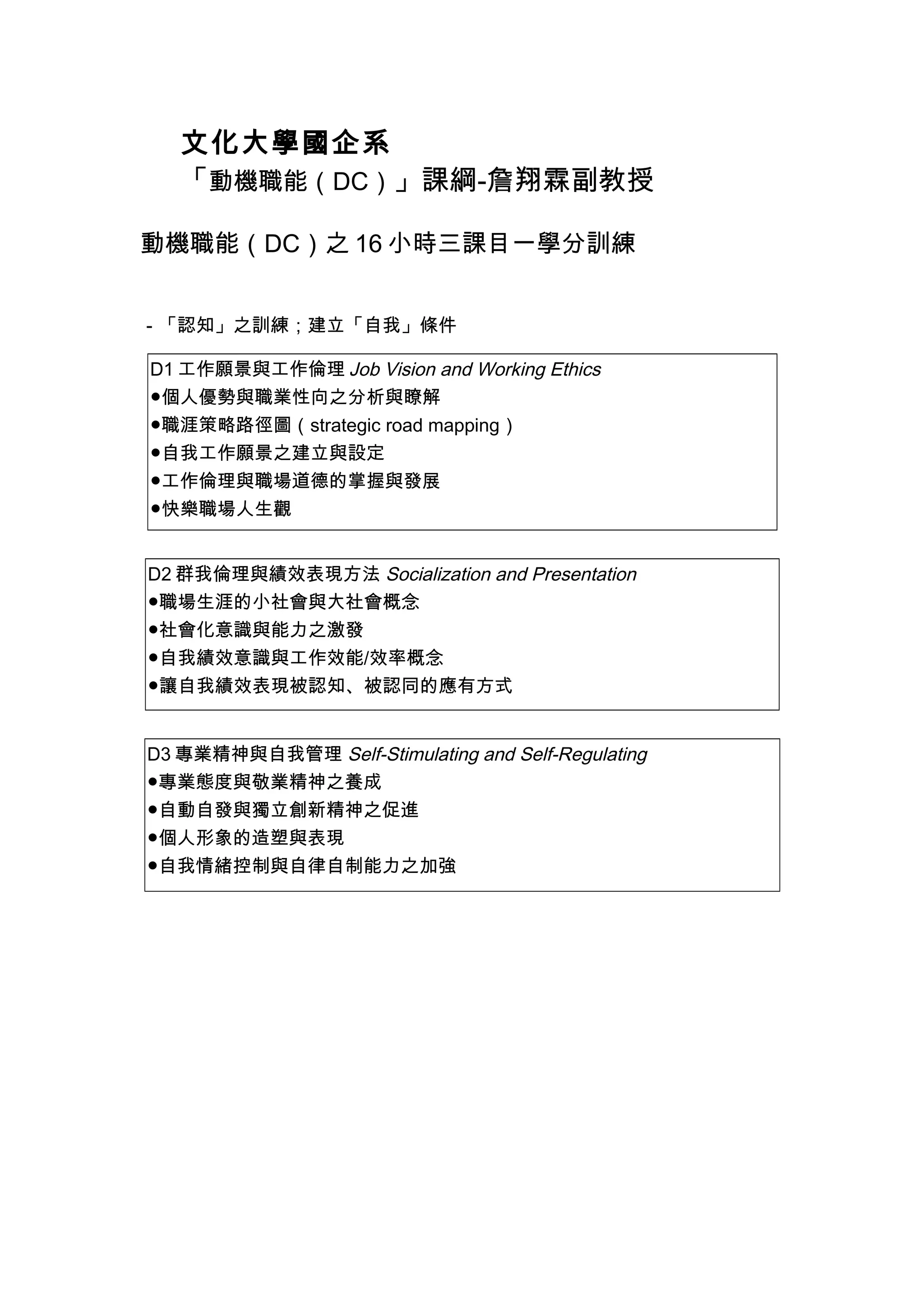 该文档概述了文化大学国企系副教授詹翔霖的“动机职能(dc)”课程大纲,涵盖了个体认知、自我管理与职场伦理的培训。课程分为三个单元,涉及工作愿景、群体伦理与绩效表现,及专业精神与自我管理等主题,总共16小时,主要通过讲授和实践演练相结合的方式进行。目标在于提升学生的职业发展能力、提升职场竞争力和情绪管理能力。