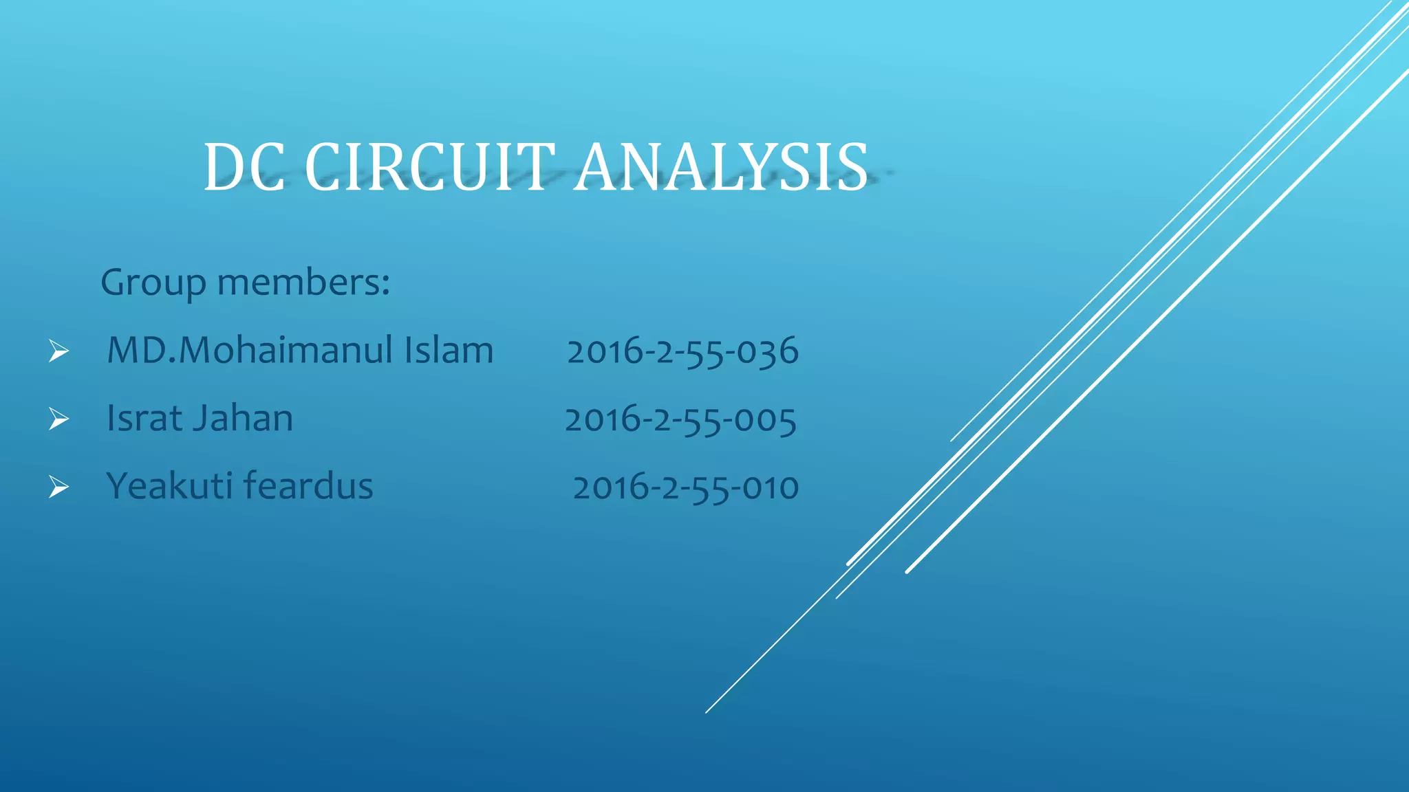 The document summarizes key circuit analysis concepts taught to a group of students including: 1) It discusses the mesh theorem and superposition theorem, which states the voltage across a circuit element is the sum of voltages due to each independent source. 2) It also reviews RC circuits composed of resistors and capacitors, and RL circuits made of resistors and inductors. 3) The document is intended to teach circuit analysis concepts to students including Md. Mohaimanul Islam, Israt Jahan, and Yeakuti Feardus.