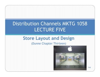 The document discusses store layout and design. It covers the objectives of store layout planning, which are to implement a retailer's strategy, influence customer buying behavior, control costs, provide flexibility, and meet legal requirements. The key elements of store layout that impact customers are store image, space allocation, merchandise placement, and aisle planning. Effective store layout and design can attract customers, help them find items, encourage spending more time and money in the store.