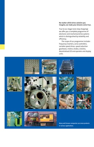 The document discusses Lenze DC motors of the MGFRK, MGFQU, and MGFQK series. It provides technical specifications for these motors including rated power, speed, torque, current draw, enclosure type, cooling method, insulation class, weight, inertia, field excitation voltage and current, and bearing type. It also describes features like temperature monitoring, options for fittings brakes and encoders, ambient temperature ratings, altitude effects on power, and terminal box configurations.