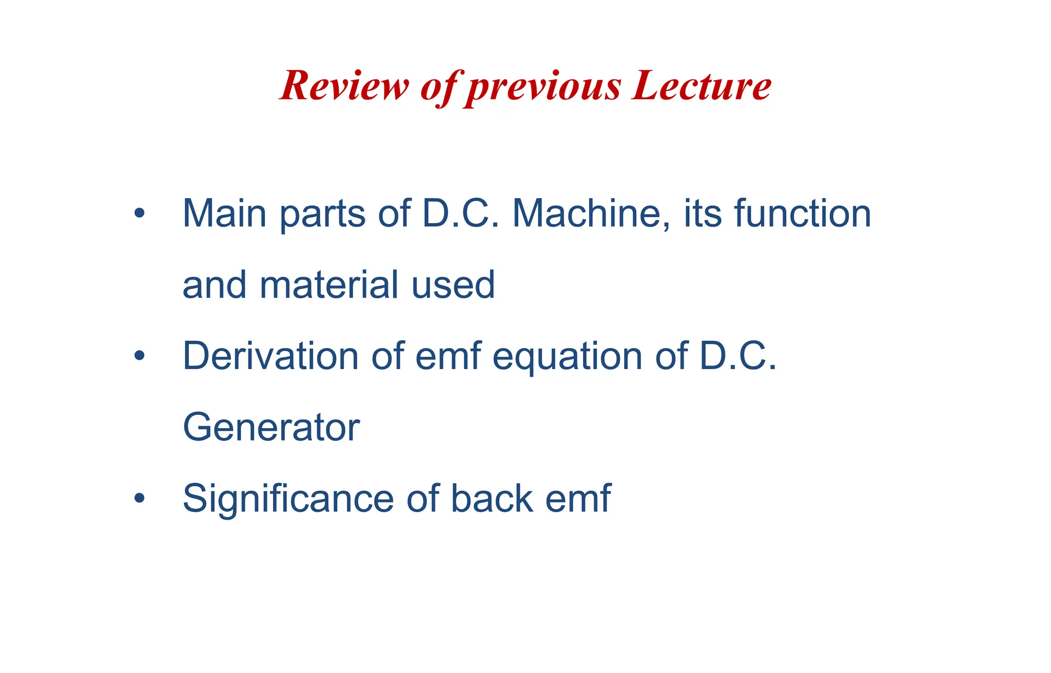 The document reviews key concepts related to D.C. machines, including main components, the derivation of the EMF equation, and the significance of back EMF. It covers different types of D.C. motors, such as shunt, series, and compound motors, and their applications in various industries. Students will learn to explain motor types, derive voltage and current equations for each, and understand how to reverse the motor's direction of rotation.