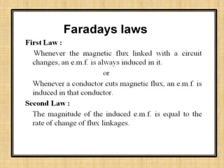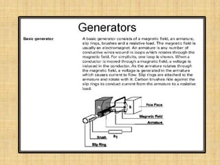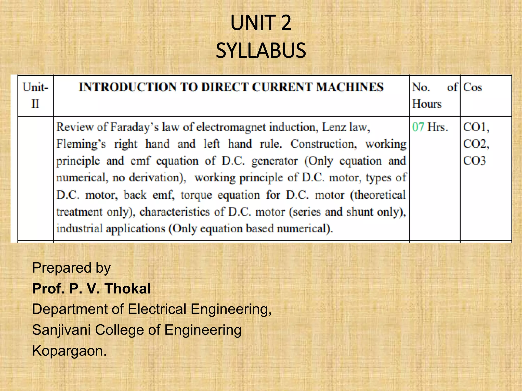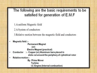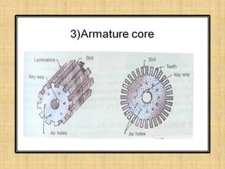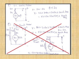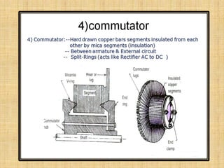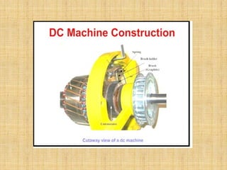 This document provides an overview of DC machines including generators and motors. It discusses the working principles, construction details, types of DC motors including shunt, series and compound motors. It covers key concepts such as EMF equation, back EMF, torque equation and characteristics of DC motors. It also discusses starters for DC shunt motors and speed control methods including flux and armature voltage control. Finally, it briefly mentions some industrial applications of DC motors.