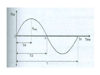 A DC generator converts mechanical energy into electrical energy using electromagnetic induction. It consists of a magnetic frame, field poles, an armature, and a commutator. The armature rotates under the poles, cutting the magnetic flux and inducing an EMF. The commutator converts the alternating EMF into a pulsating DC voltage. DC generators are classified as separately excited, self-excited (series, shunt, compound), depending on how the field is connected. A DC motor operates on the principle that a current-carrying conductor in a magnetic field experiences a torque. It consists of an armature, field poles, a commutator, and brushes. The back EMF opposes the applied voltage