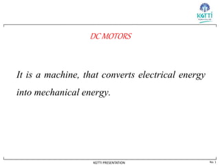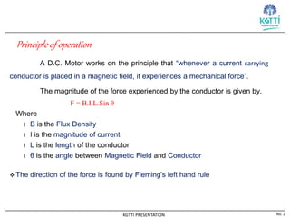 A DC motor converts electrical energy into mechanical energy using the principles that a current carrying conductor placed in a magnetic field experiences a force. It has a stator that houses field windings and a rotor that rotates. There are different types of DC motors including separately excited, series, shunt, and compound motors. Series motors have high starting torque but low speed regulation while shunt motors have low starting torque but good speed regulation, making each suitable for different applications.
