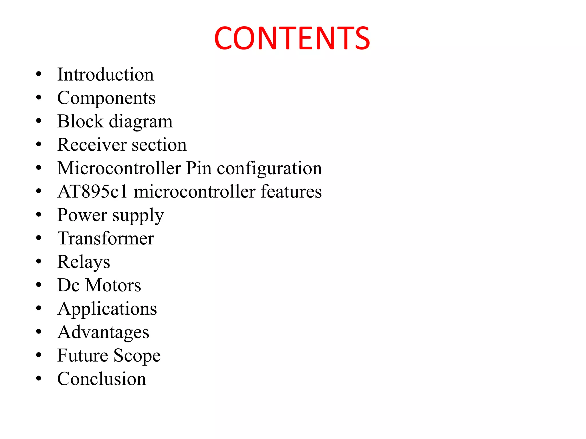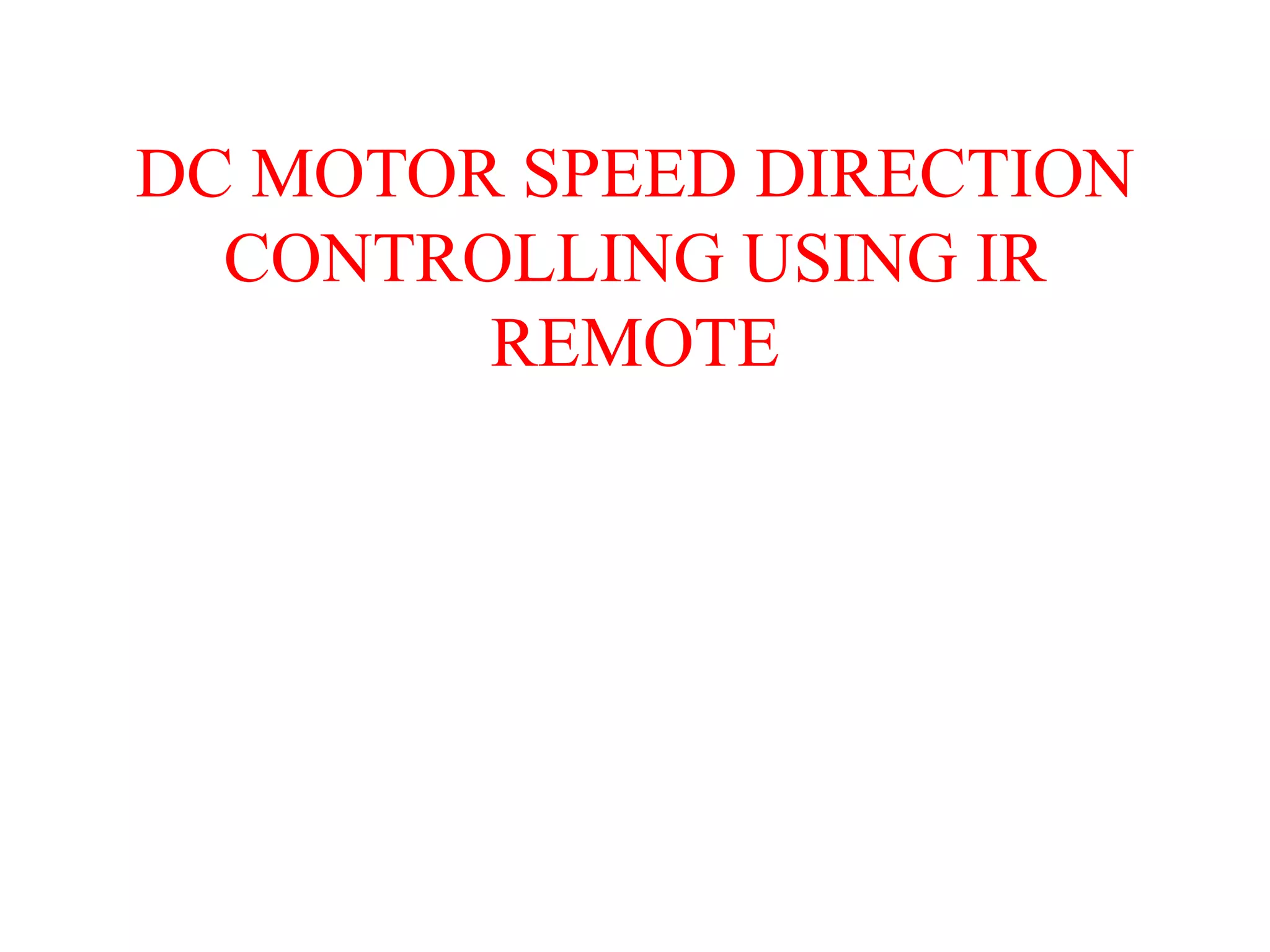 This document describes a project to control the speed and direction of a DC motor using an IR remote. It contains sections on the components used, including an AT89S52 microcontroller, IR receiver, motor driver IC, relays, and DC motor. The IR remote acts as the transmitter, sending signals to the receiver connected to the microcontroller. The microcontroller reads the signals and controls the motor driver IC and relays to rotate the motor clockwise, counterclockwise, or change its speed. The project has applications in remote control and has advantages of easy control of speed and torque with a simple, cheap design.