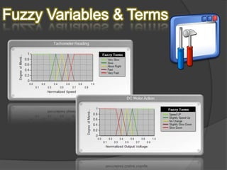 This document summarizes the design and implementation of a fuzzy logic controller for speed control of a DC motor. It describes creating a fuzzy logic class library in Visual Studio, defining the Mamdani fuzzy system and input/output variables, adding trapezoidal and triangular membership functions to fuzzify the speed input and output voltage, writing five fuzzy rules to relate them, and taking a screenshot of the project.