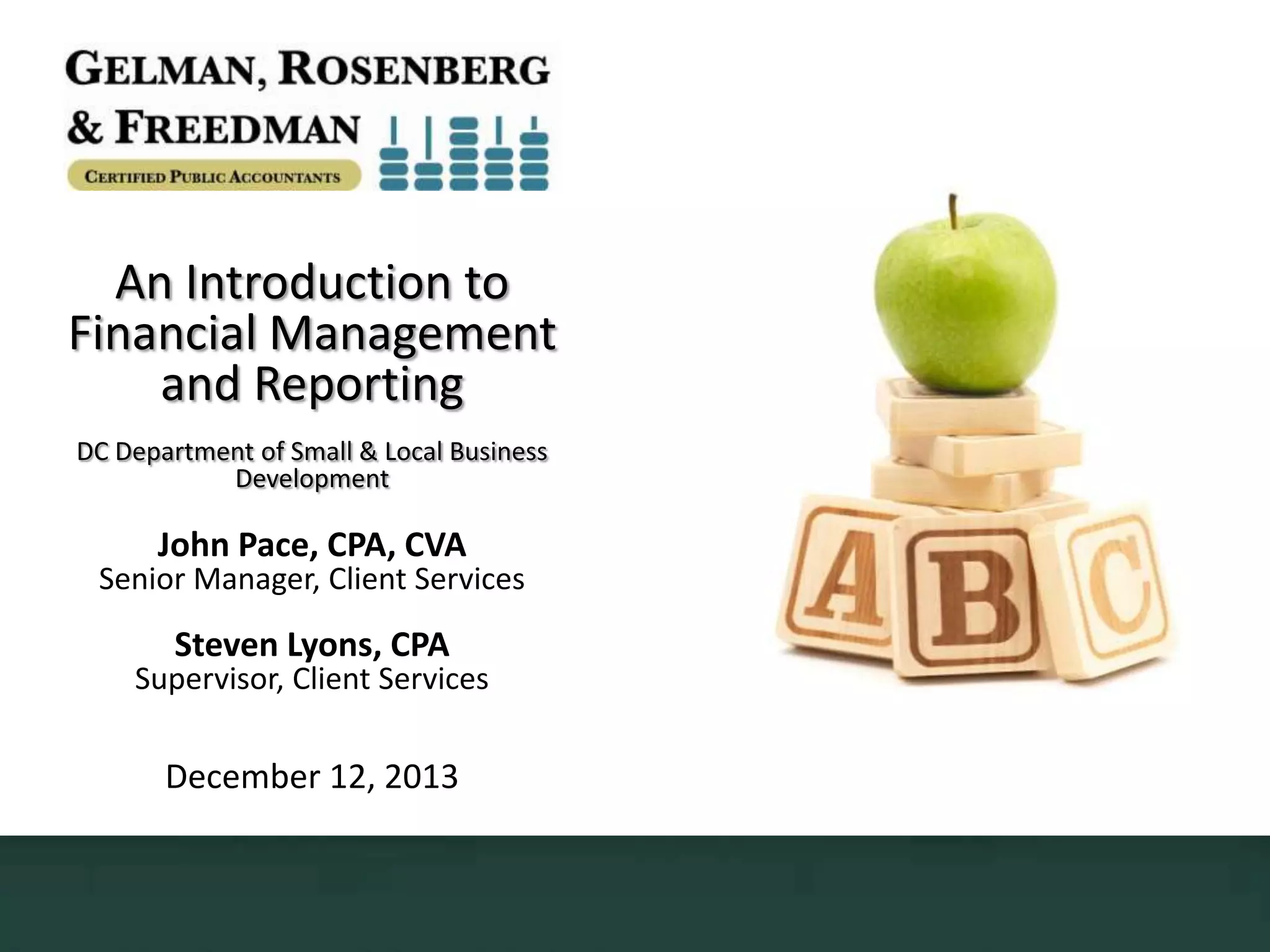 This document provides an introduction to financial management and reporting presented by John Pace and Steven Lyons of Gelman, Rosenberg & Freedman CPAs. It discusses key financial statements including the balance sheet, income statement, cash flow statement, and equity statement. It also covers common internal reports such as budgets and cash flow projections. The presentation provides examples and explanations of financial reporting concepts and terminology.