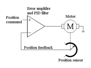 1) A servo is a feedback control system that controls the position or motion of a mechanical system. It receives an input signal and uses feedback to control velocity and position.