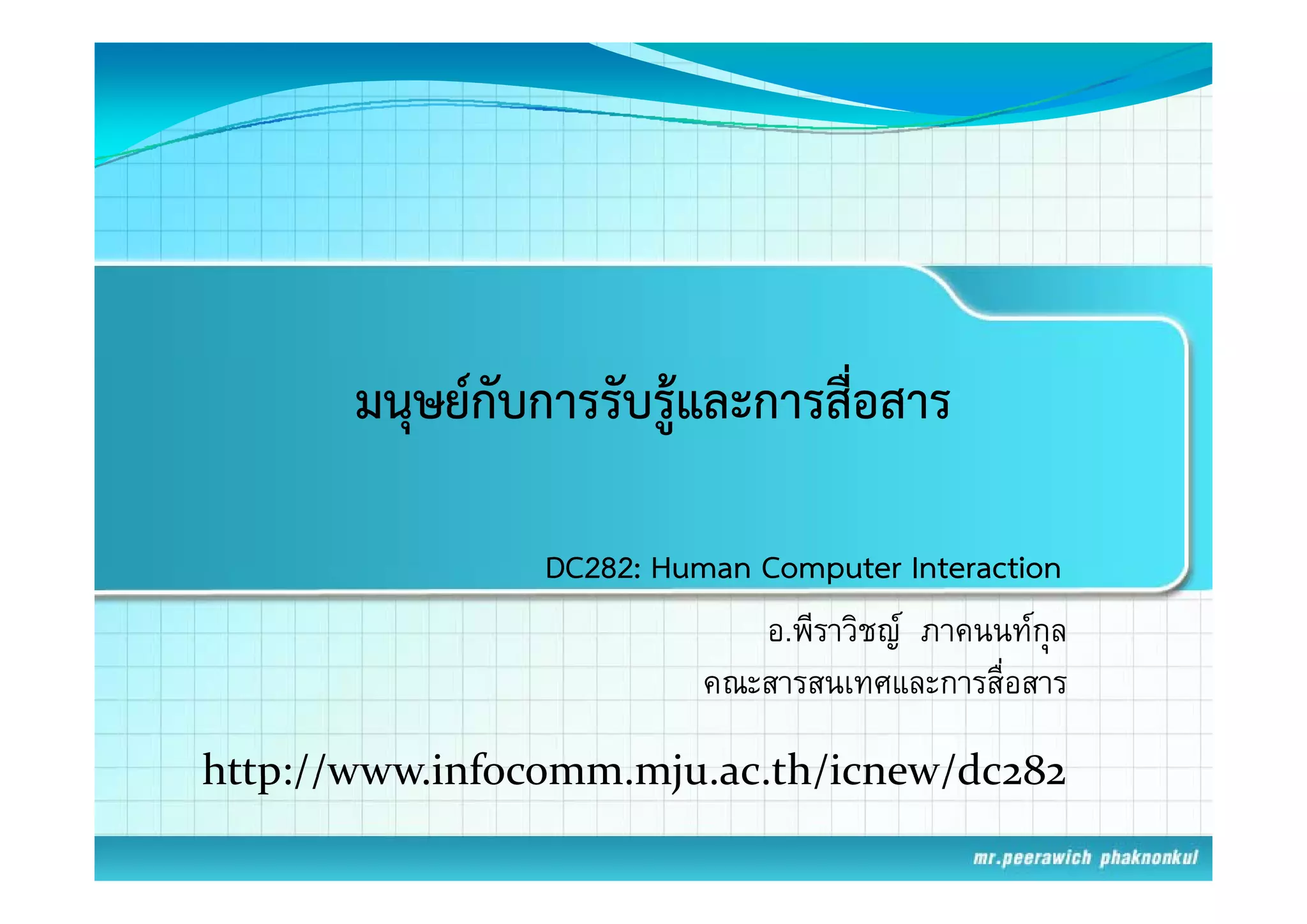 DC282: Human Computer Interaction อ.พีราวิชญ ภาคนนทกุล คณะสารสนเทศและการสืื่อสาร http://www.infocomm.mju.ac.th/icnew/dc282 http://www infocomm mju ac th/icnew/dc282