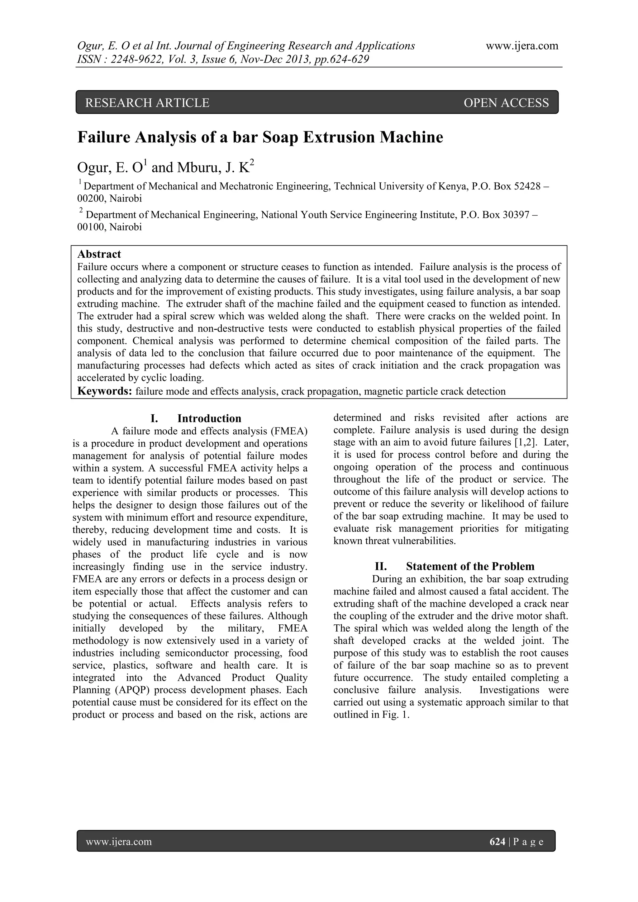 This document presents a failure analysis of a bar soap extrusion machine caused by a cracked extruder shaft, attributed to poor maintenance and defects during manufacturing. Various testing methods, including magnetic particle and dye penetrant tests, revealed cracks and weld flaws, while chemical and mechanical analyses confirmed the material's properties. The findings emphasize the need for improved manufacturing processes and specific loading capacities to prevent future failures.