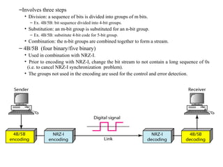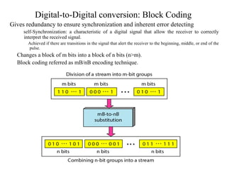 Block coding involves dividing a bit stream into blocks, substituting code blocks for data blocks, and combining the code blocks. It provides error detection and ensures synchronization. 4B/5B and 8B/10B block codes map 4- and 8-bit groups to 5- and 10-bit codes. Scrambling techniques like B8ZS and HDB3 modify AMI encoding to prevent long runs of zeros from disrupting synchronization. PCM converts analog signals to digital using sampling, quantization, and encoding. It samples the signal, assigns amplitude levels, and encodes each sample as a code word. Transmission can be parallel, sending multiple bits simultaneously over multiple wires, or serial, sending one bit at a time over