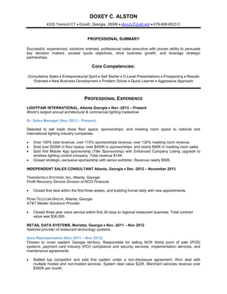 Doxey Alston has over 20 years of experience in professional sales, specializing in technology solutions. He has consistently exceeded sales quotas across multiple roles in industries such as telecommunications, lighting, and restaurant technology. Alston holds degrees in business management and has received numerous sales awards and certifications.