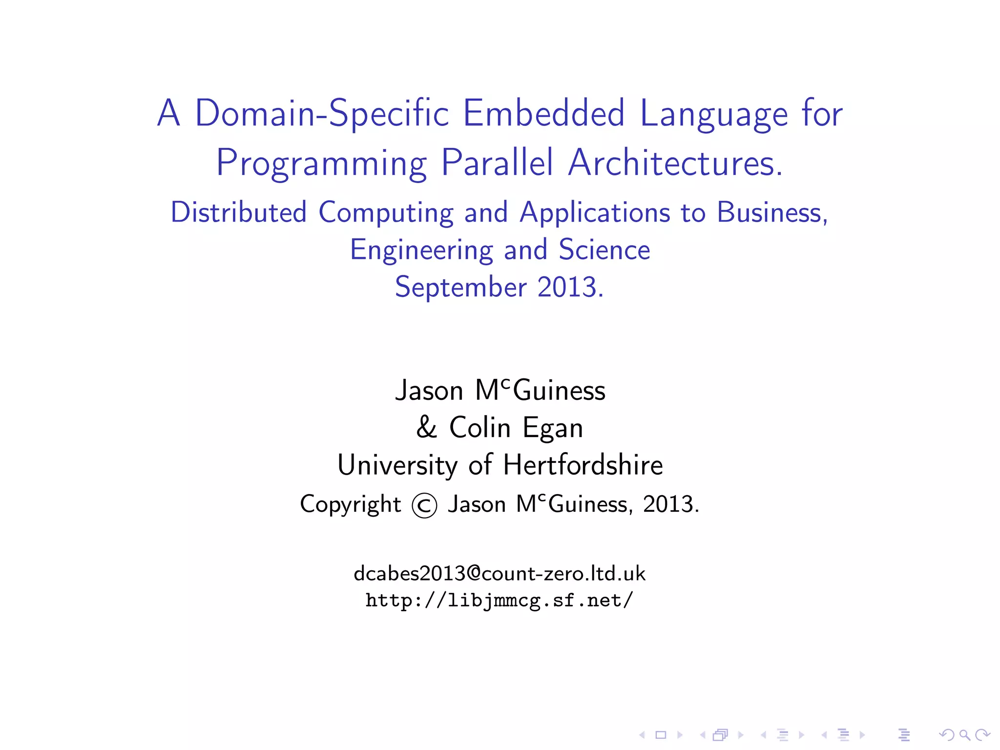 This document proposes a domain-specific embedded language (DSEL) for programming parallel architectures. The DSEL aims to enable parallelism while avoiding issues like deadlocks, race conditions, and complex APIs. It presents the grammar and properties of the proposed DSEL, including that it generates schedules that are deadlock-free and race-condition free. Examples demonstrating data flow and data parallelism using the DSEL are also provided.