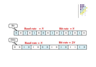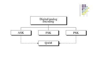 The document discusses various digital transmission methods, including encoding techniques for converting digital data into signals. It covers line coding types such as unipolar, polar, return-to-zero, and Manchester encoding, as well as modulation techniques like amplitude, frequency, and phase modulation. Additionally, it addresses transmission modes such as asynchronous and synchronous transmission.
