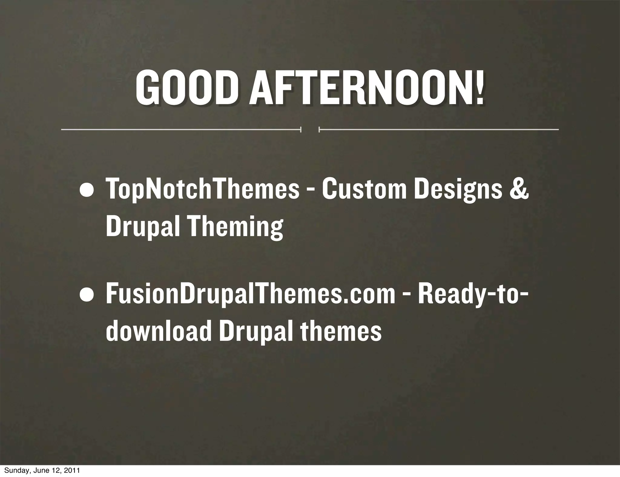 This document summarizes a presentation about sustainable theming using Fusion Drupal themes. It discusses common unsustainable habits like assuming static content, striving for pixel perfection, and repeating styles. Quick fixes for sustainable theming are presented, including designing for abstraction, using a solid base theme, styling generally to create flexibility, and using the Fusion theme and Skinr module which allow non-developers to easily change styles without coding. Resources for learning more about Fusion theming are provided.