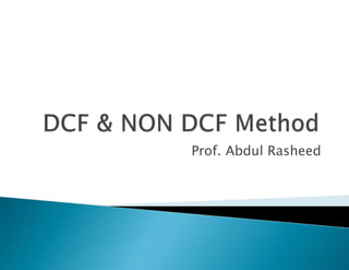 This document discusses techniques for discounted cash flow analysis including net present value (NPV), internal rate of return (IRR), and time value of money. It provides examples of calculating NPV and IRR for projects and investment decisions. It also compares the advantages and disadvantages of NPV and IRR as metrics for investment evaluation.