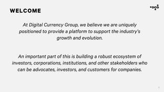 The Digital Currency Group (DCG) focuses on building a robust ecosystem to support the growth of digital currencies and blockchain technology, emphasizing their transformative potential for financial markets and global economies. In 2017, they reported significant portfolio growth, with investments in over 110 companies across 28 countries, and outlined their investment strategy targeting various stages and areas within the industry. The company is cautiously optimistic about the emergence of new asset classes while acknowledging the risks and challenges, including regulatory scrutiny and market volatility.