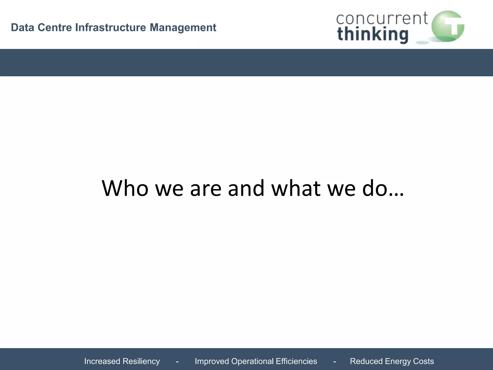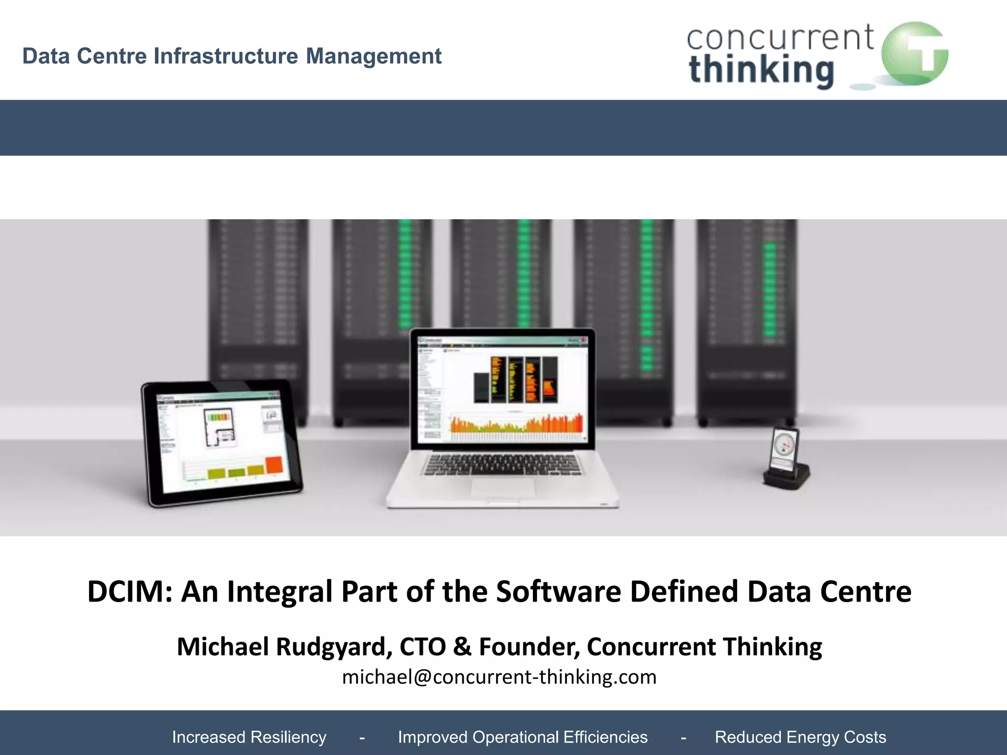 The document outlines the role of Data Centre Infrastructure Management (DCIM) in enhancing operational efficiency, resiliency, and energy savings in data centres. It describes the evolution of DCIM from facilities management to a more integrated approach that manages power, cooling, and resource allocation effectively. It highlights the challenges, business drivers, and future prospects of DCIM, particularly its convergence with cloud infrastructure and the shift towards automated management.