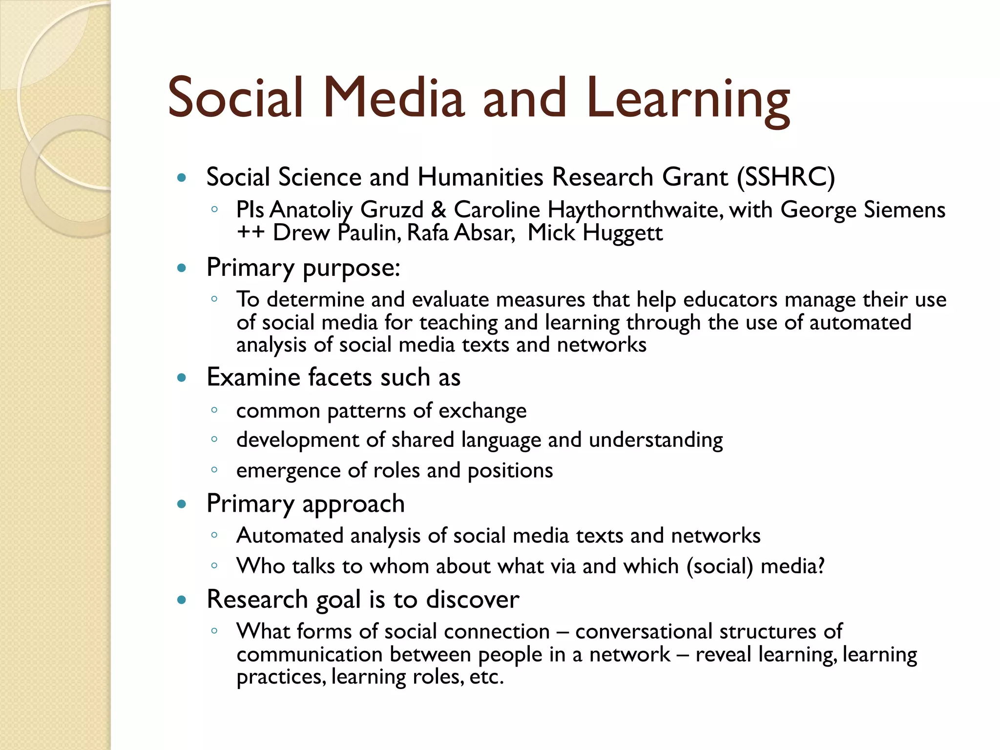 The document discusses a research project aimed at understanding how educators can effectively use social media for teaching and learning through automated analysis of social media texts and networks. It explores the connections between social networks, discourse, and learning, emphasizing the importance of relationships and communication in learning practices. The research involves analyzing textual interactions to evaluate learning ties and network dynamics in various online contexts.