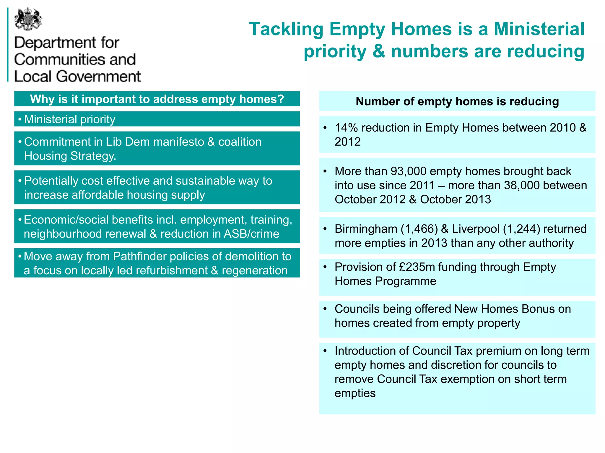 - The number of empty homes has decreased by 14% between 2010-2012, with over 93,000 homes brought back into use since 2011.