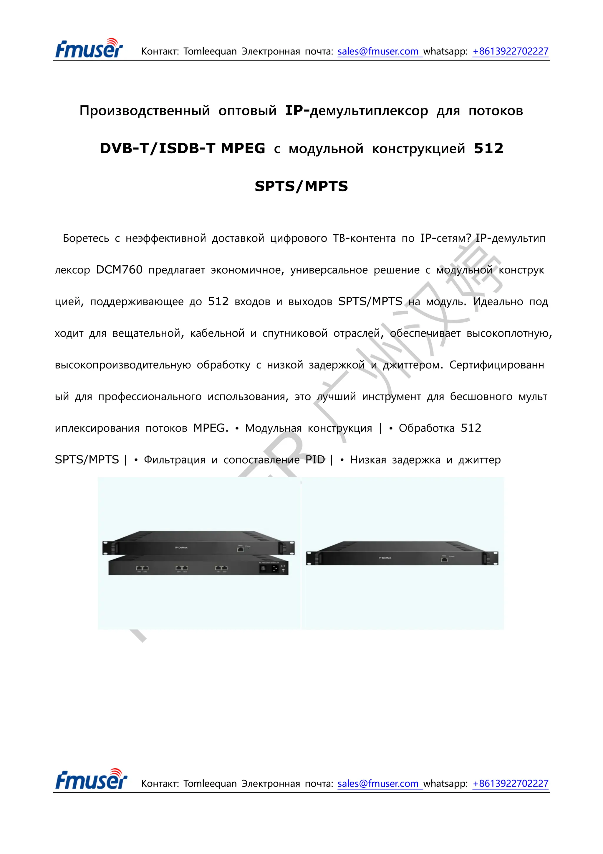 Боретесь с неэффективной доставкой цифрового ТВ-контента по IP-сетям? IP-демультиплексор DCM760 предлагает экономичное, универсальное решение с модульной конструкцией, поддерживающее до 512 входов и выходов SPTS/MPTS на модуль. Идеально подходит для вещательной, кабельной и спутниковой отраслей, обеспечивает высокоплотную, высокопроизводительную обработку с низкой задержкой и джиттером. Сертифицированный для профессионального использования, это лучший инструмент для бесшовного мультиплексирования потоков MPEG. • Модульная конструкция | • Обработка 512 SPTS/MPTS | • Фильтрация и сопоставление PID | • Низкая задержка и джиттер