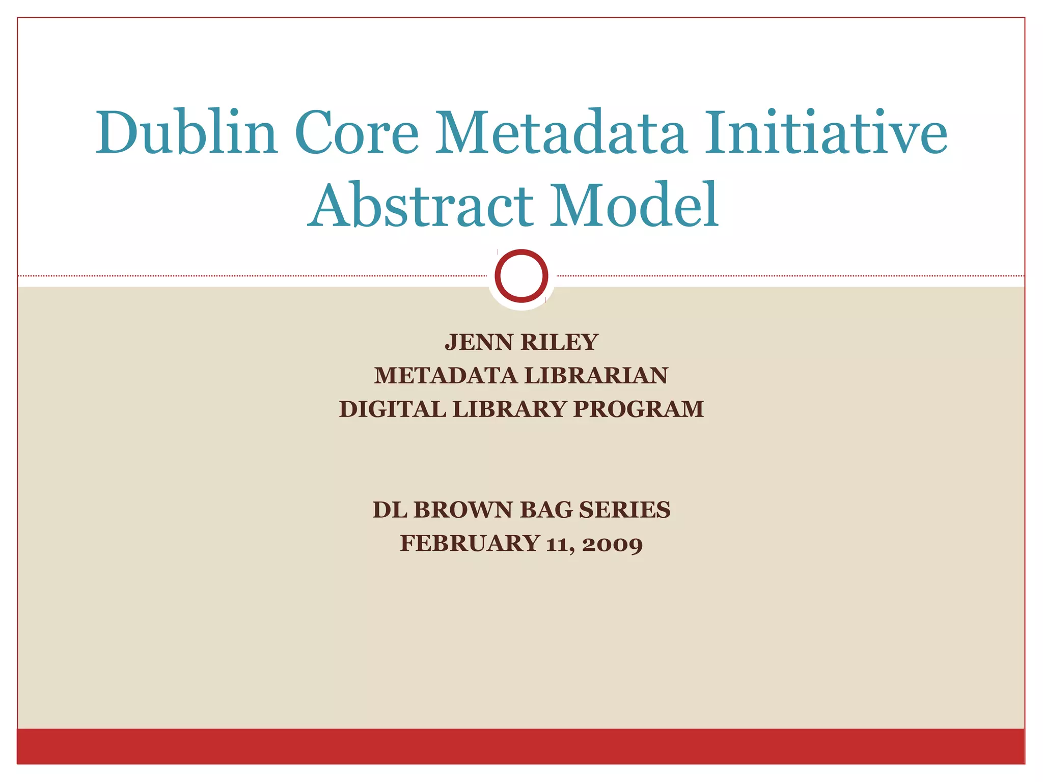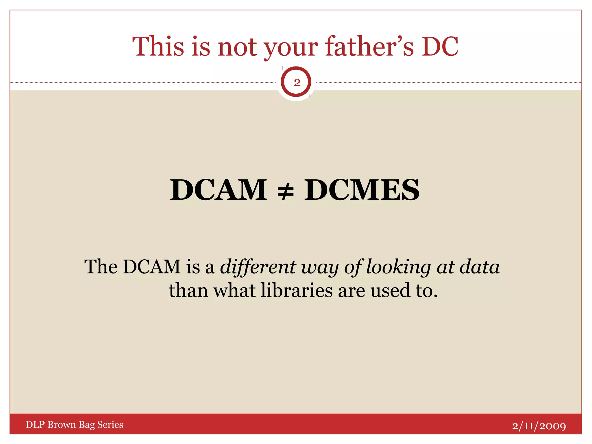 The document provides an overview of the Dublin Core Metadata Initiative Abstract Model (DCAM). It discusses how the DCAM differs from traditional Dublin Core by viewing metadata as an abstract model rather than a standard encoding. Key points of the DCAM include describing resources with property-value pairs, distinguishing literal and non-literal values, and representing vocabularies as URIs. The DCAM aims to improve metadata interoperability through application profiles. There is debate in the library community around implementing the DCAM and aligning it with standards like MODS, though the DCAM could become more prevalent over time.