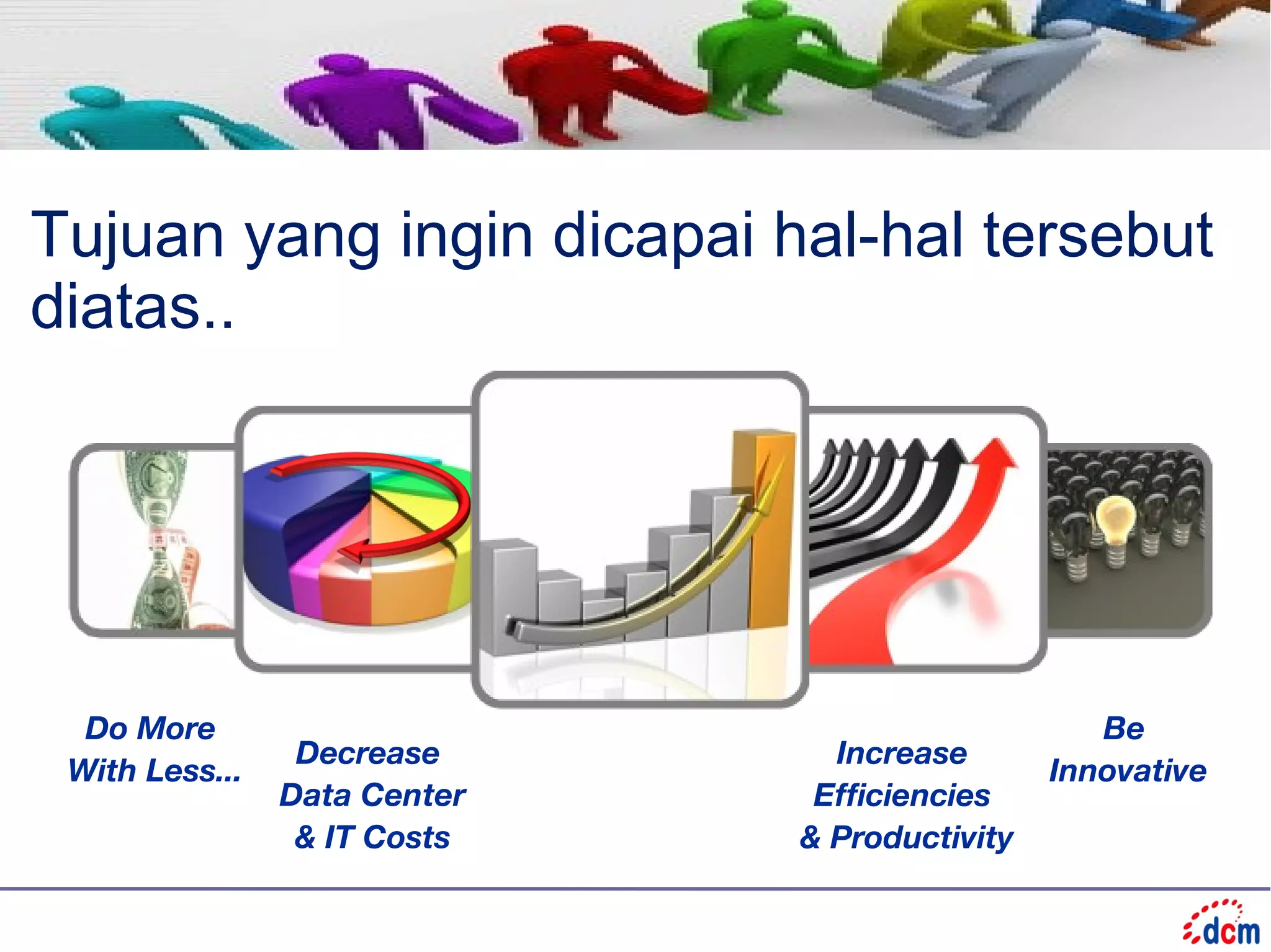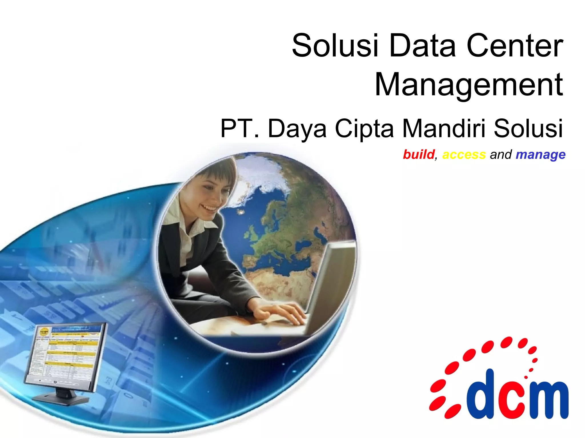 Dokumen ini membahas solusi manajemen data center dari PT. Daya Cipta Mandiri, yang mencakup perencanaan, pengelolaan, dan pemantauan infrastruktur untuk efisiensi dan pengendalian biaya. Solusi ini meliputi sistem pemantauan untuk perangkat aktif, database, serta kondisi fisik ruang data center. Terdapat juga beberapa opsi konfigurasi untuk sistem pemantauan dengan sensor dan kemampuan pengiriman alert.