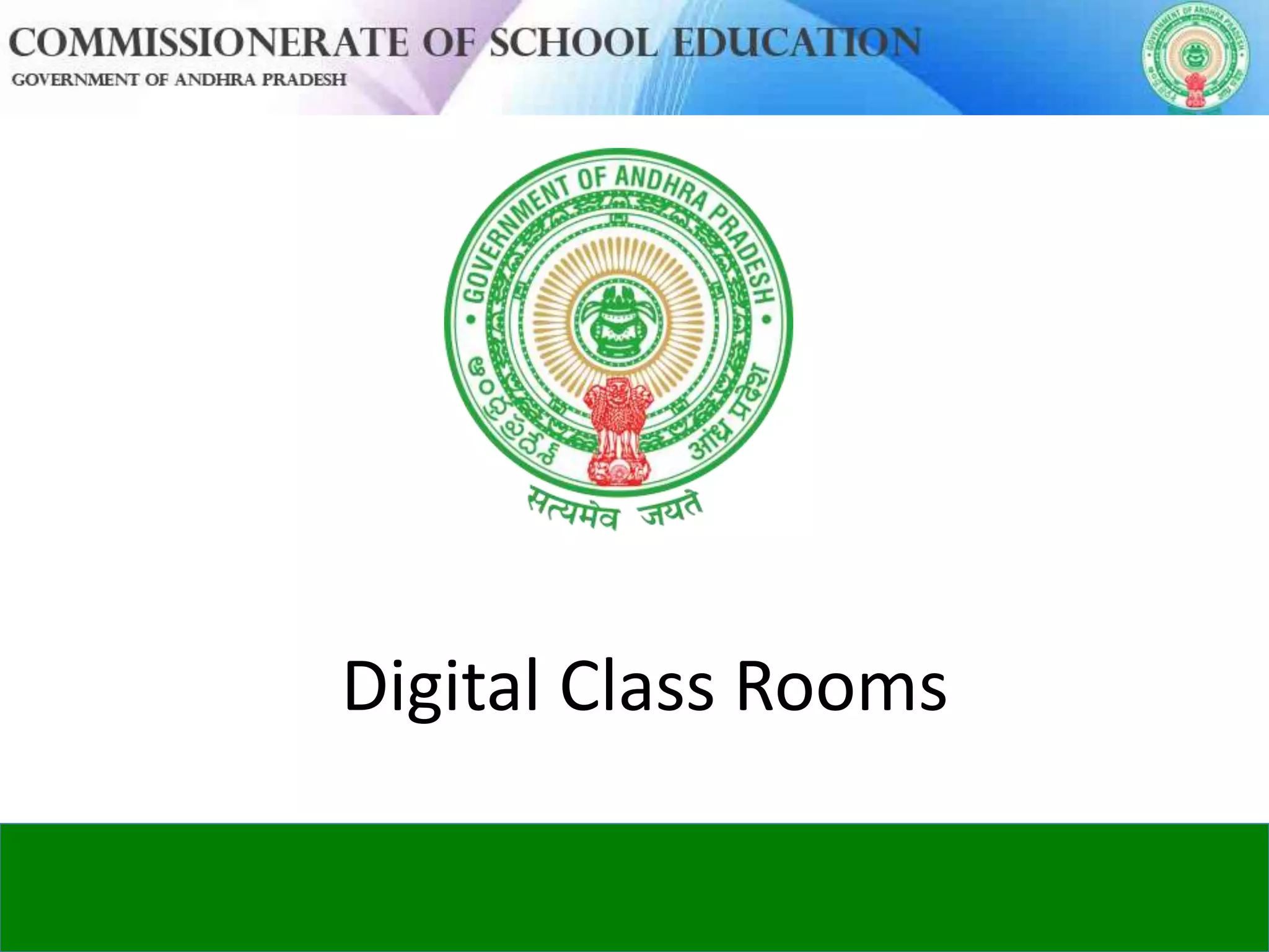 The document discusses the implementation of digital classrooms in schools. It explains that digital classrooms improve learning outcomes through a teacher-led educational solution that allows students to learn at their own pace using interactive content. Key components of the digital classrooms include computers, projectors, UPS devices, networking equipment, and printers. Sample lesson plans are provided showing how teachers can integrate digital content such as videos and assessments into their classroom teaching. Best practices for digital classrooms include viewing content before class, pausing videos for discussion, and using online teacher forums to share resources. The goal is to prepare students for the 21st century with technology-enabled learning.