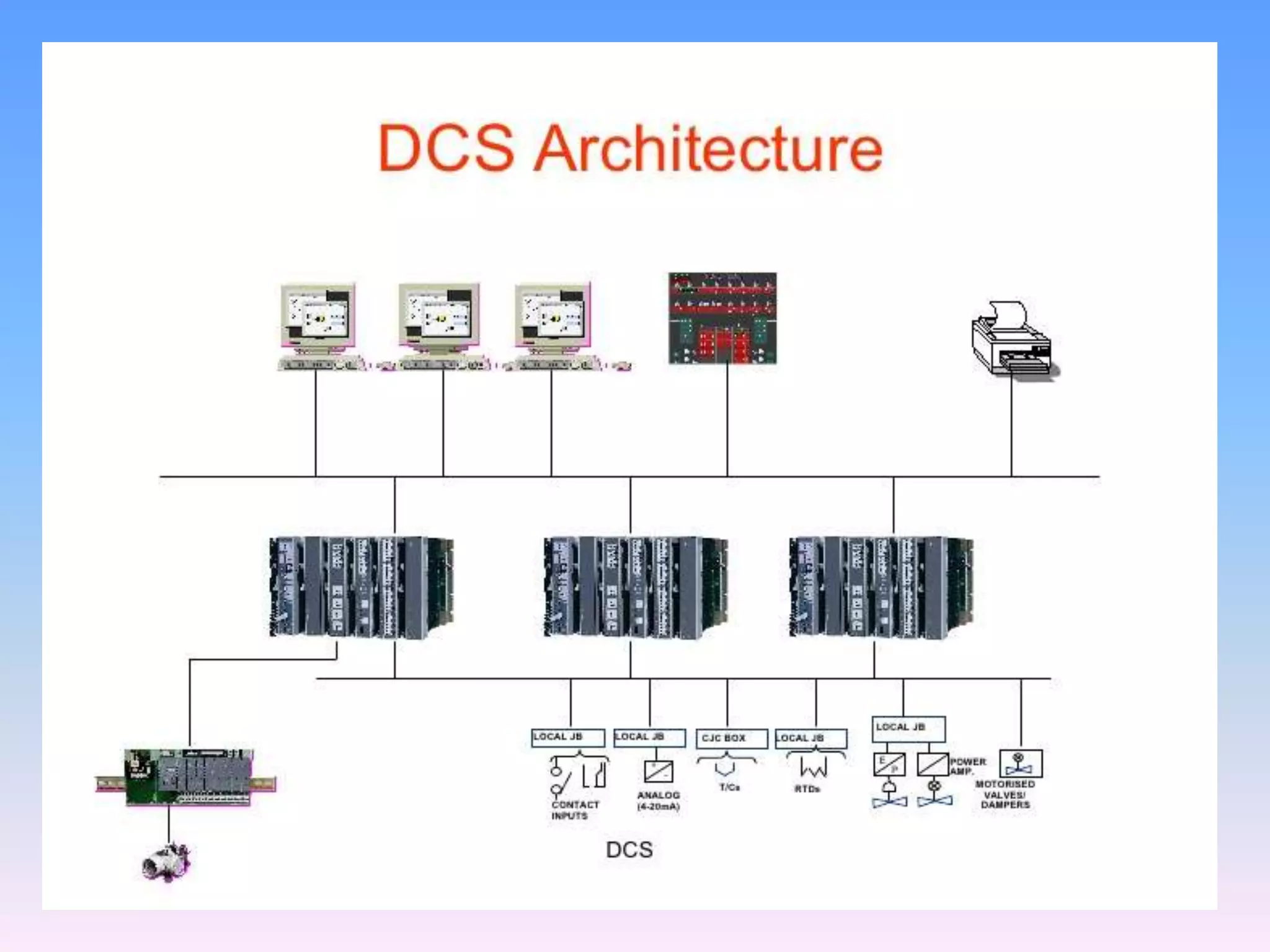 The document discusses control systems and distributed control systems (DCS). It defines a control system as using feedback to maintain or alter quantities according to a desired state. A DCS uses distributed controllers and communication networks to control large, complex industrial processes. Key components of a DCS include field devices, input/output modules, controllers, human-machine interfaces, and control engineering software. DCS are suitable for large chemical plants, refineries, and other industrial applications where centralized control is not feasible.