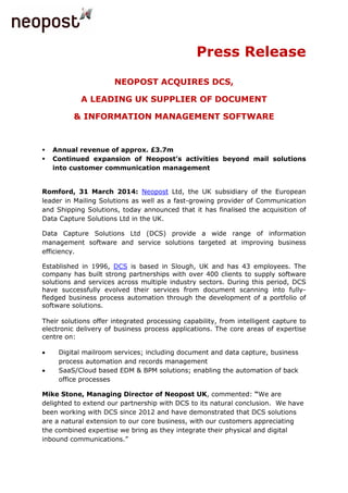 Neopost, a European leader in mailing solutions and communication services, has acquired DCS, a UK provider of document and information management software. DCS has 43 employees, 400 clients, and annual revenue of £3.7 million. Neopost aims to expand its customer communication management offerings beyond mail solutions with this acquisition. Both Neopost and DCS executives expressed excitement about growth opportunities through combining their complementary expertise and customer bases.