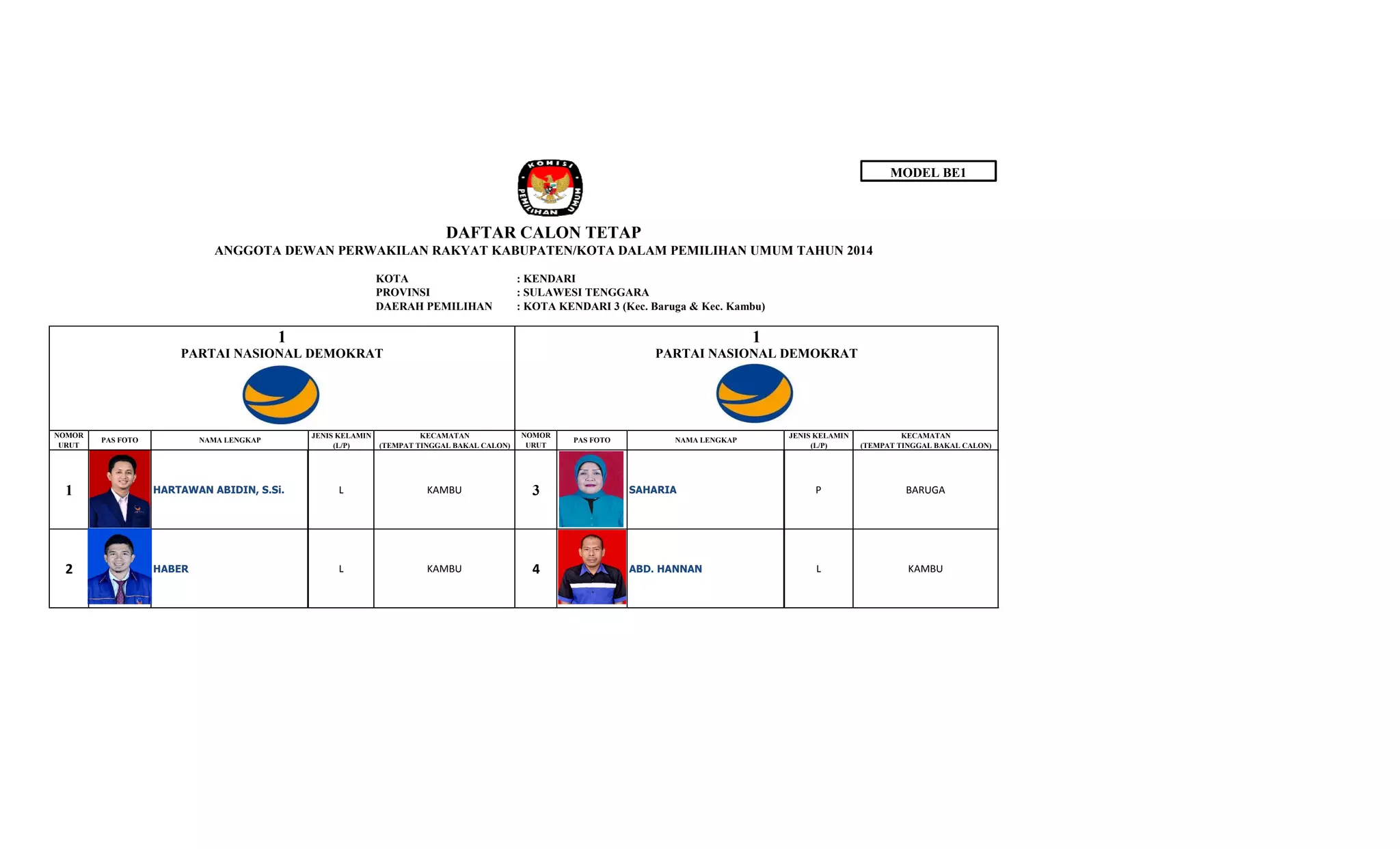 Dokumen tersebut berisi daftar calon tetap anggota Dewan Perwakilan Rakyat Kabupaten/Kota Kota Kendari 3 untuk pemilihan umum tahun 2014 dari lima partai politik beserta identitas masing-masing calon.