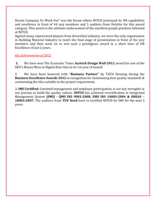 NITCO received the 20th rank for "Dream Employer of the Year" at the World HRD Congress Awards 2013 in Mumbai for its innovative HR programs that achieved business results and drove organizational excellence. As the only building materials company to make the final presentation round, NITCO won this prestigious award within just 2 years of focusing on HR excellence. In 2012, NITCO also won awards for one of its digital floor tile designs, was honored as a business partner by Tata Housing, and achieved recertification of its integrated management system for quality, environmental, and health and safety standards.