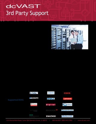 dcVAST is a third party IT support company that offers exceptional customer service through their Service First Philosophy. They have a comprehensive service flow including a live domestic call center, immediate incident escalation, and direct access to technical support engineers. dcVAST also has a superior service delivery model with over 149,000 parts stored across 131 locations allowing for fast distribution. They provide operational advantages such as simplified contracts and flexible service level agreements to help customers contain costs. dcVAST supports solutions from OEMs such as Cisco and can assist customers with both on-premise and data center infrastructure needs due to their 28 years of IT experience.