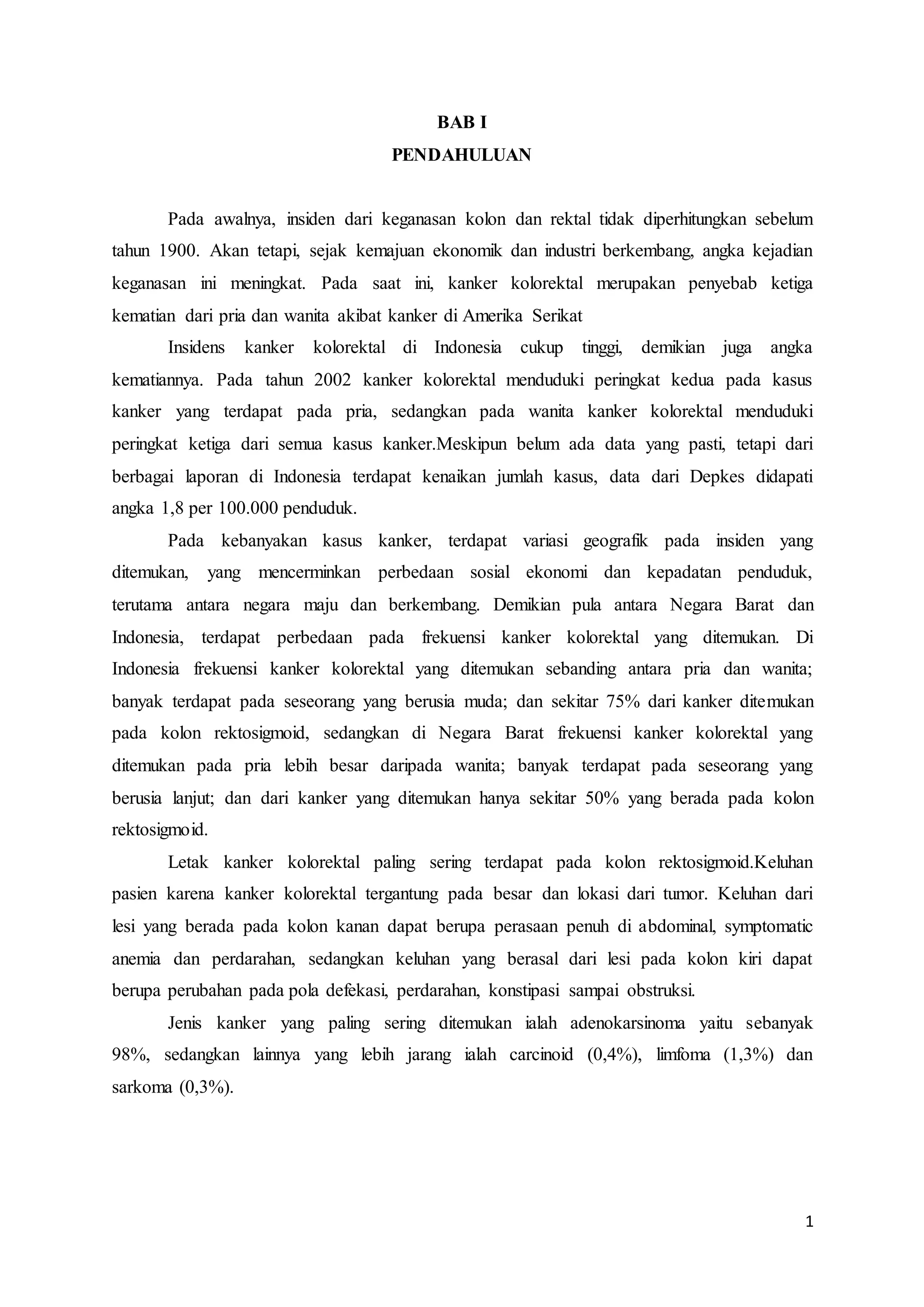 Kanker kolorektal merupakan penyebab kematian ketiga bagi pria dan wanita di AS dan memiliki insiden tinggi di Indonesia, dengan faktor risiko termasuk usia di atas 40 tahun dan adanya riwayat keluarga. Jenis kanker yang paling umum adalah adenokarsinoma, dan kebanyakan kasus terjadi pada kolon rektosigmoid. Diet tinggi serat dapat menurunkan risiko, sementara konsumsi daging merah meningkatkan risiko kanker kolorektal.