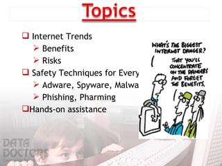 This document provides tips and guidance on internet safety. It discusses the benefits of internet use but also the risks like malware, phishing and exposure to inappropriate content. It emphasizes that children and adults use the internet differently and parents should be involved in their child's online activities. It provides tips for safe internet practices like using antivirus software, strong passwords, backing up data and installing security updates.