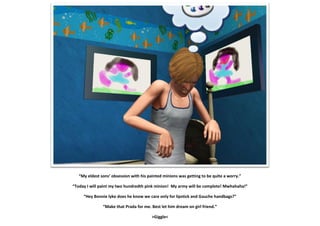 This document describes a family dealing with the antics of their eldest son Darcy and his obsession with painting pink minions. Darcy's mother grows frustrated with his hundreds of minion paintings filling their house and bans him from painting more. Later, Darcy threatens to become a burglar in retaliation. Their other sons Douglas and Donald enjoy swimming and holding breath-holding competitions, relaxing their mother. Darcy eventually moves on to painting other subjects besides minions.
