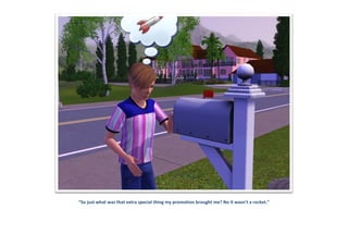 The document describes a Sim family as the father, Deaglan, retires. For his retirement party, a Simbot shows up and one of the guests dies, causing a commotion. Deaglan makes wishes and is happy to retire. His daughter Dawn does well in school and life. As he ages, Deaglan celebrates with his family and plays in the sprinkler on his first day of retirement. The family looks forward to how Darcy will develop as a young adult.