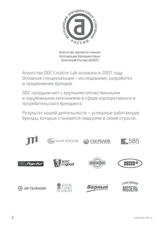 Агентство ddc creative lab, основанное в 2007 году, специализируется на исследовании, разработке и продвижении брендов, сотрудничая с крупными отечественными и международными компаниями. В документе представлены примеры успешного корпоративного и продуктового брендинга, включая разработку фирменного стиля для различных клиентов из разных отраслей. Особое внимание уделяется уникальным визуальным концепциям и символике, отражающим ценности и особенности продукции.