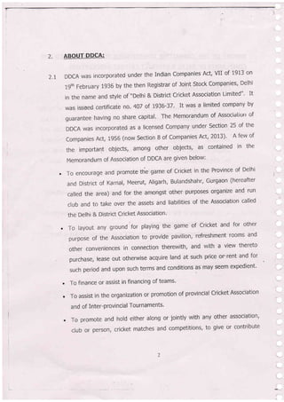 The document summarizes the findings of a committee that was established to investigate complaints against the Delhi & District Cricket Association (DDCA). The committee found widespread irregularities, including a lack of transparency in player selection and club recognition. It also found that DDCA had made unauthorized loans and payments to inter-related companies, and paid professionals without proper approval. Additionally, an internal DDCA fact-finding committee had also found evidence of "huge financial irregularity", including payments to duplicate vendors and falsified records. The document provides details of these and other findings of the investigating committee.
