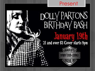 The document details an event hosted by the 'Droppdedddollies' at Diablo's Downtown Lounge featuring a 'fake Dolly Parton' impersonator and Millie, scheduled for January 19th. The show is for individuals aged 21 and over with a $3 cover charge. Music variety will be provided during the event, which starts at 9 PM at the venue located at 959 Pearl St, Eugene.