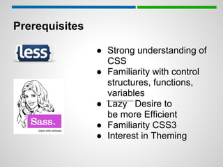 This document provides an introduction to Less, Sass, and Compass, which are CSS preprocessors. It discusses prerequisites including a strong understanding of CSS and familiarity with control structures and variables. The goals are to understand the high-level purpose of preprocessing languages and learn how to get started using them. Methods for using Less, Sass, and Compass with Drupal are presented, including modules and command line tools. Key concepts demonstrated include variables, mixins, importing, and frameworks like Compass. The document encourages questions and provides additional learning resources.