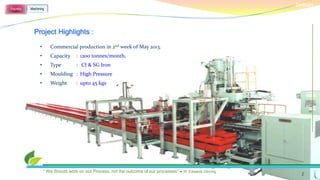 Deltran Diesels Engineering Pvt. Ltd. specializes in grey and SG iron casting and machining, with a production capacity of 1200 tonnes per month. The company employs advanced technologies and quality systems to ensure zero cost of poor quality, and focuses on best foundry practices, energy management, and employee satisfaction. Future plans include incorporating automation and creating a rapid prototyping center to support new models and compliance with emission norms.