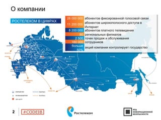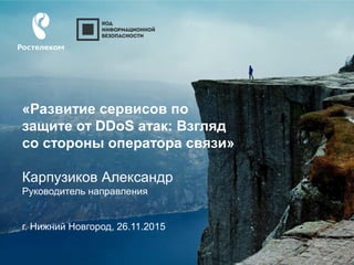 Документ представляет обзор методов защиты от DDoS-атак со стороны оператора связи Ростелеком, включая статистику по количеству абонентов и технические аспекты проведения атак. Освещены различные типы DDoS-атак, такие как amplification и reflection, а также способы их анализа и предотвращения. Также упомянуты преимущества Ростелекома как крупнейшего оператора в России в области защиты от DDoS-атак, включая современное оборудование и опыт в отражении угроз.