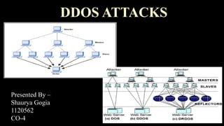 This document discusses distributed denial of service (DDoS) attacks. It begins with an introduction that defines DDoS attacks as attempts to make an online service unavailable by overwhelming it with traffic from multiple compromised sources. The document then covers the basics of DDoS attacks, common symptoms, how they work by exploiting vulnerabilities in systems to create botnets for launching attacks, and various methods like ICMP floods and SYN floods. It also discusses ways to handle DDoS attacks through defenses like firewalls, switches, and routers. The document concludes with preventative and reactive defense mechanisms to detect and respond to attacks.