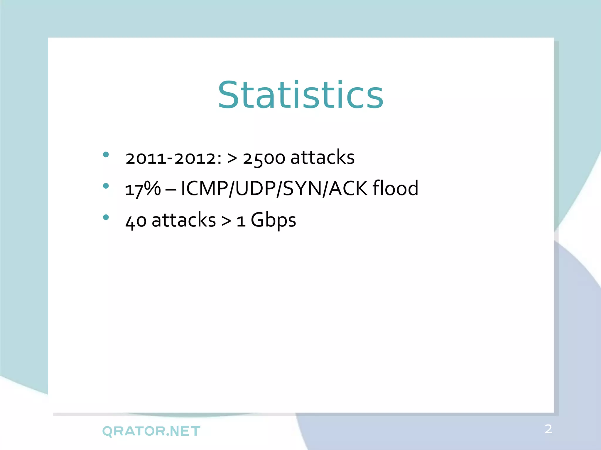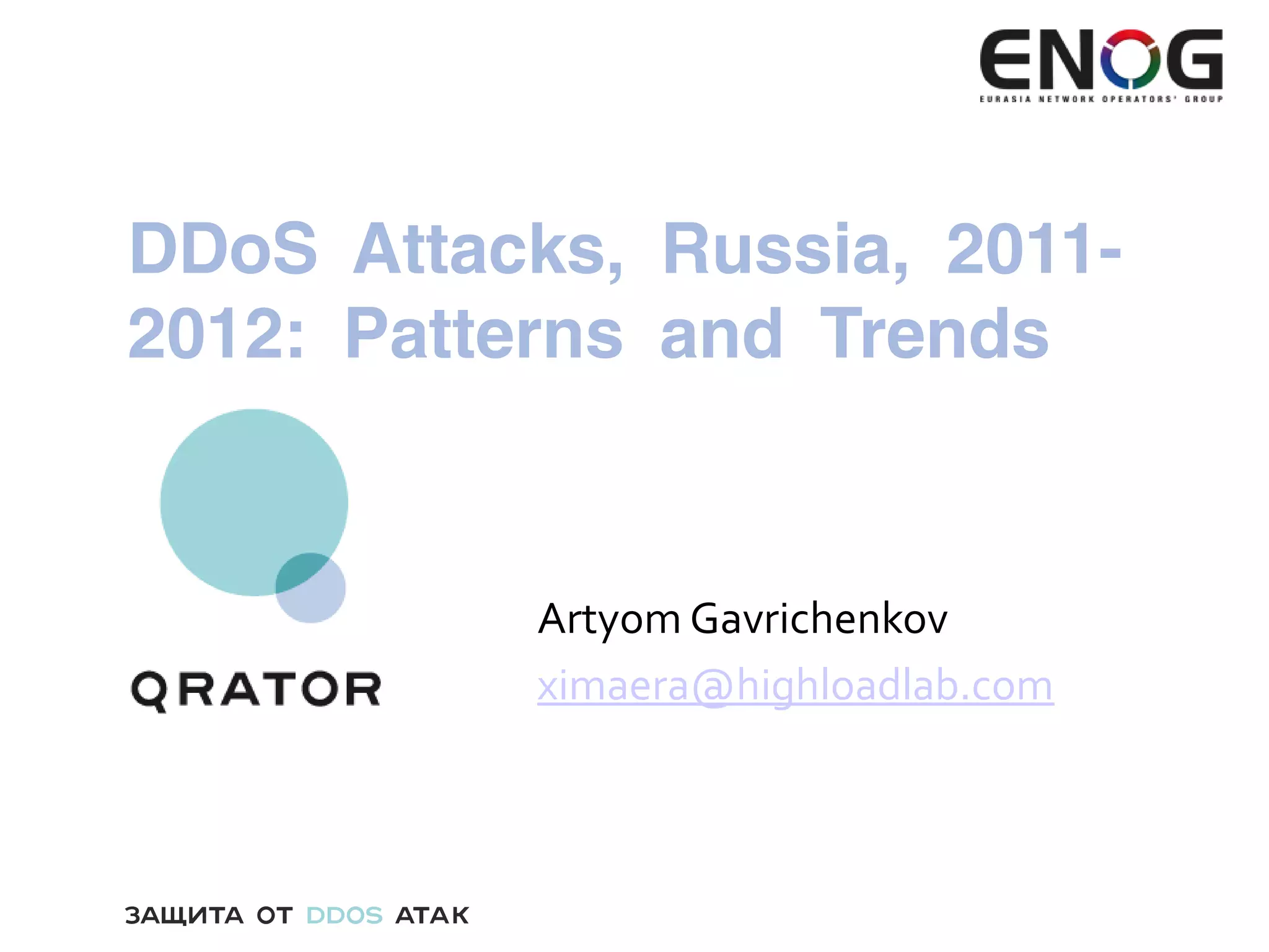 The document analyzes DDoS attack patterns and trends in Russia from 2011 to 2012, reporting over 2,500 attacks with peaks in intensity and duration. Key statistics include a maximum attack bandwidth of 56 Gbps and a botnet size reaching 200,000 bots. It highlights that attacks are often motivated by financial gain, political purposes, or botnet promotion, with a notable increase in attack frequency during weekends.