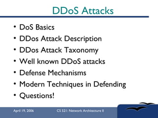 The document provides an in-depth overview of Distributed Denial of Service (DDoS) attacks, explaining their definition, methods of execution, types, and famous examples. It outlines attack mechanisms such as target resource exhaustion and exploitation of network vulnerabilities, along with defense strategies including preventive and reactive measures. The document concludes by emphasizing the ongoing challenge of defending against DDoS attacks and the need for cooperation between legitimate users and security developers.