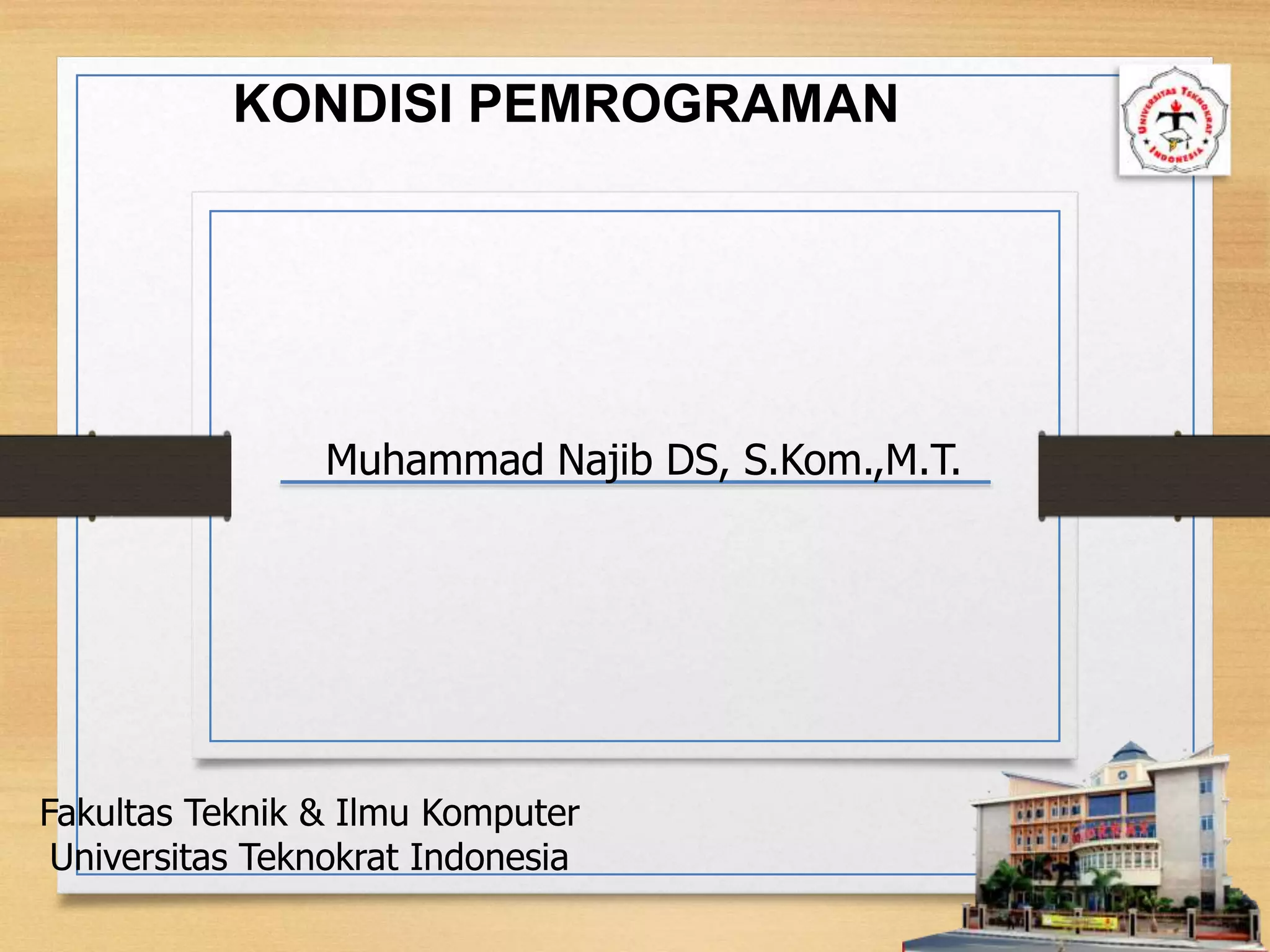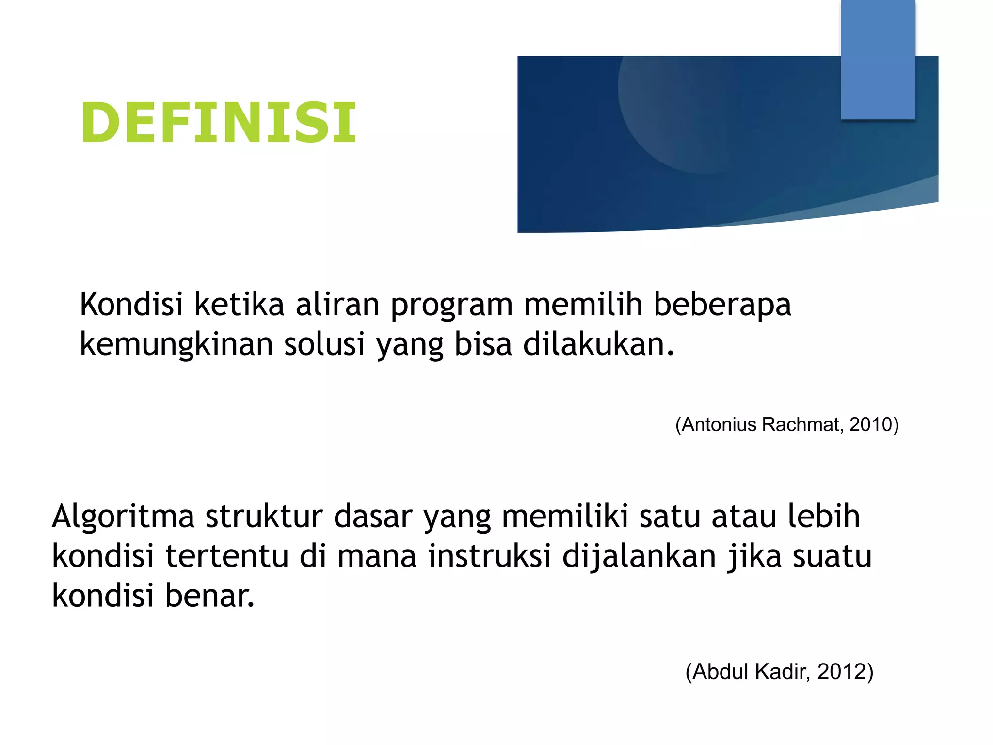 Dokumen tersebut membahas tentang kondisi pemrograman yang meliputi definisi, jenis-jenis percabangan seperti if statement, if else statement, if else if statement, dan switch case statement. Kondisi pemrograman digunakan untuk memilih beberapa kemungkinan solusi berdasarkan kondisi tertentu.