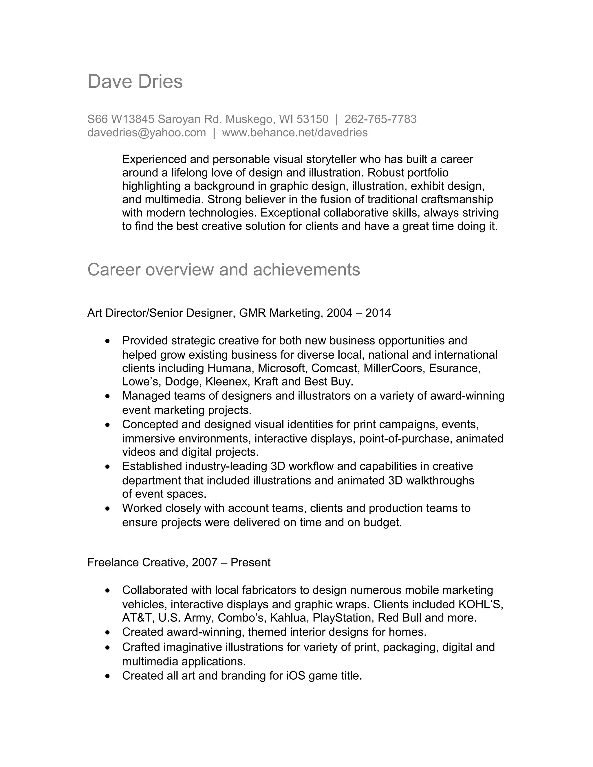 Dave Dries is a visual storyteller and experienced creative professional with over 20 years of experience in graphic design, illustration, exhibit design, and multimedia. He has worked as an art director and senior designer at GMR Marketing where he provided strategic creative direction for major clients. Currently he also works as a freelance creative collaborating with various clients on projects including mobile marketing vehicles and interactive displays. He has a robust portfolio highlighting his background and skills in both traditional and digital media.