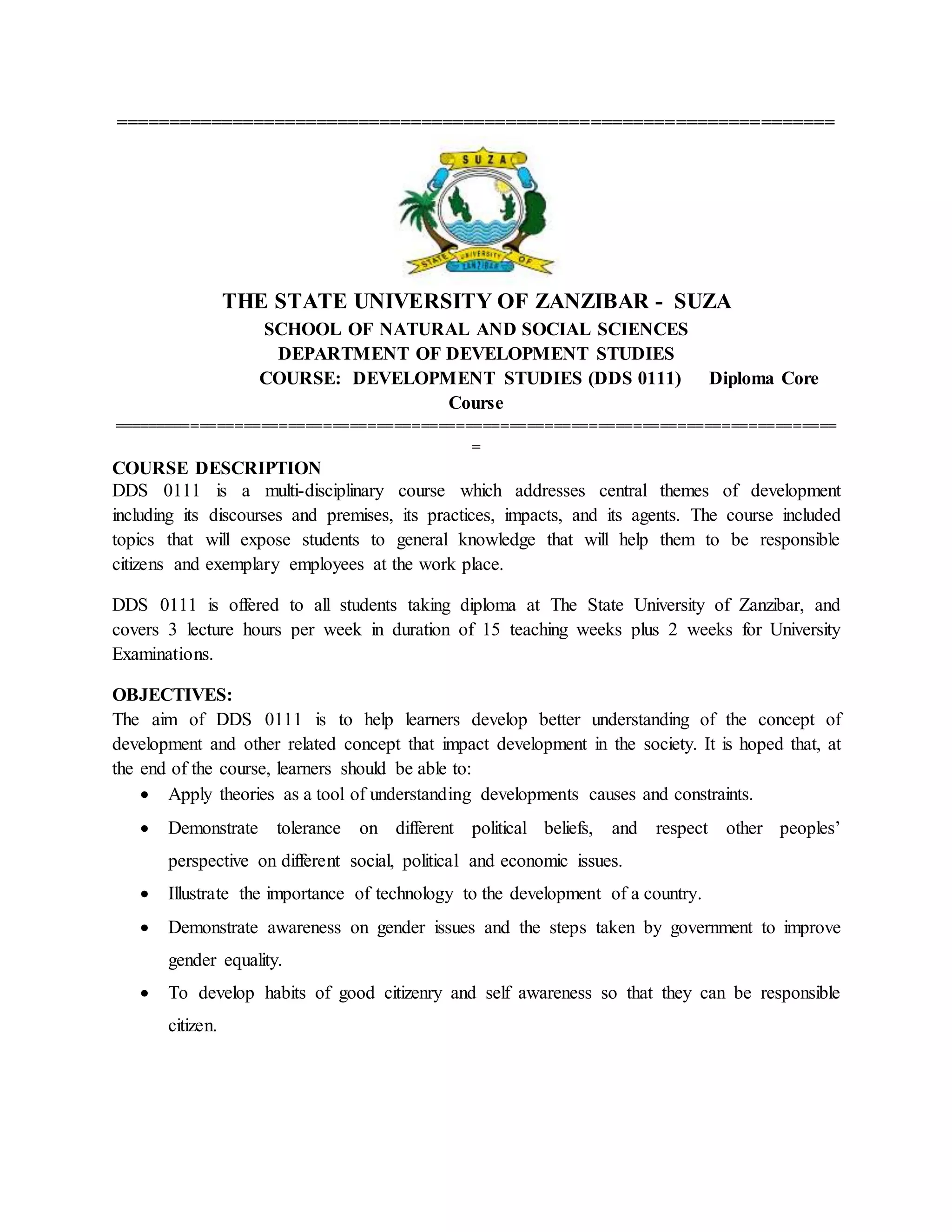 This document provides information about the Development Studies (DDS 0111) course offered at The State University of Zanzibar. The course is a multi-disciplinary diploma core course that addresses central themes of development including theories, practices, impacts, and agents of development. The course objectives are to help students develop an understanding of development concepts and theories, demonstrate tolerance of different political views, illustrate the importance of technology, and demonstrate awareness of gender issues. The course contents cover development theories, democracy and governance, science and technology, and gender and is assessed through essays, tests, seminars, participation, and an exam.