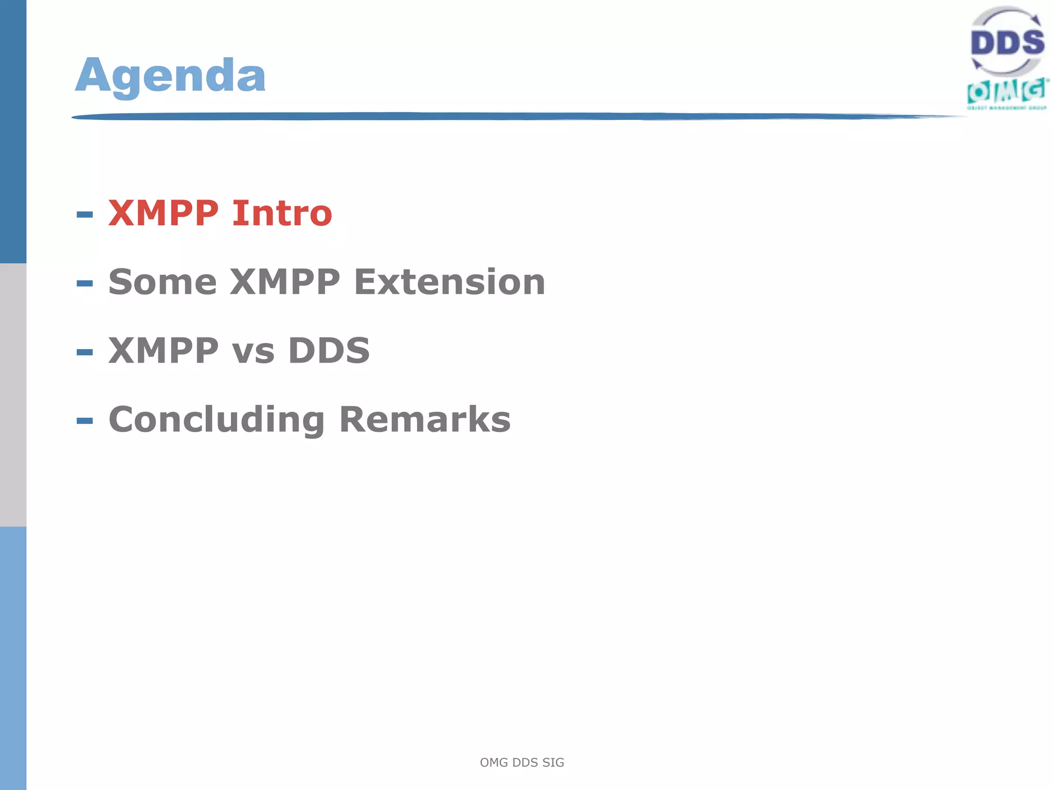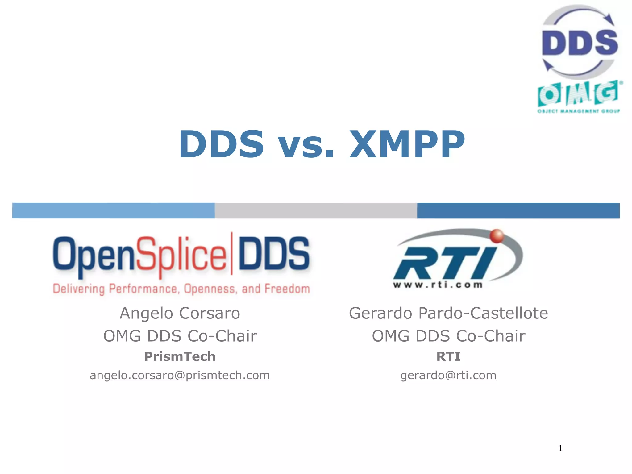 This document compares the Data Distribution Service (DDS) and the eXtensible Messaging and Presence Protocol (XMPP). It provides an introduction to XMPP including its history, core features like messaging and presence, and extensions like pub/sub. It then compares aspects of XMPP and DDS like their standardization, architecture, communication primitives, performance, and target application domains. The concluding remarks note that DDS targets more sophisticated data distribution with quality of service requirements while XMPP focuses on interactive web applications.